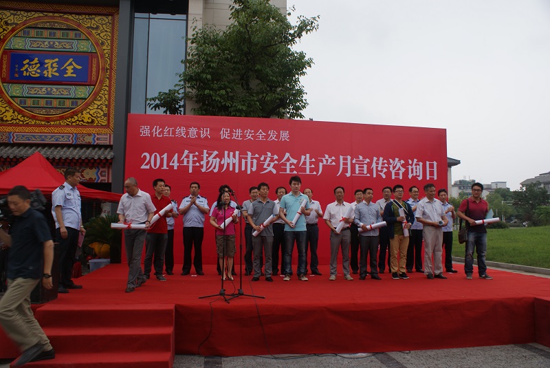 6月16日上午,揚州市安委辦會同蜀崗—瘦西湖風(fēng)景名勝區(qū)管委會在虹橋坊舉行了以“強(qiáng)化紅線意識,促進(jìn)安全發(fā)展”為主題的2014年揚州市“安全生產(chǎn)月”宣傳咨詢?nèi)栈顒印J邪参瘯、市安監(jiān)局、蜀岡—瘦西湖風(fēng)景名勝區(qū)管委會、市人保公司負(fù)責(zé)人出席了活動。市安監(jiān)局、揚汽集團(tuán)、市城建控股集團(tuán)、市工藝美術(shù)集團(tuán)、金茂化工集團(tuán)、揚子江集團(tuán)、建工控股集團(tuán)等11家單位以及消防、建筑、燃?xì)狻庀、質(zhì)監(jiān)、部分駐揚單位的職工代表共計400余人參加了活動。