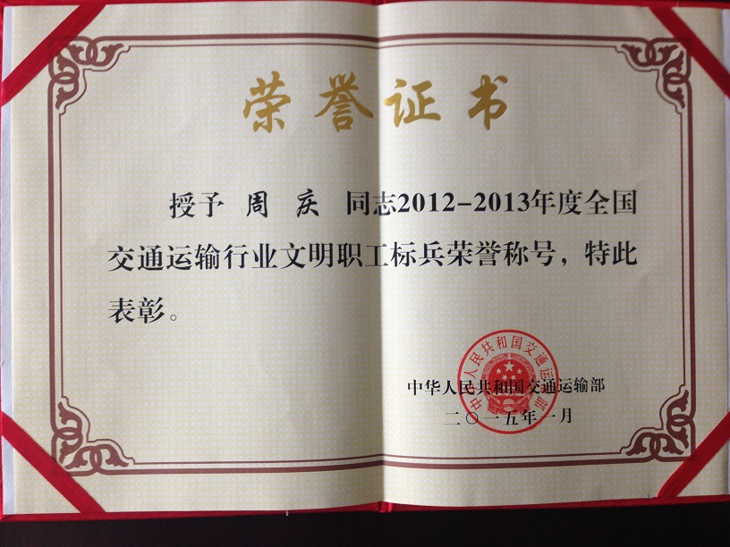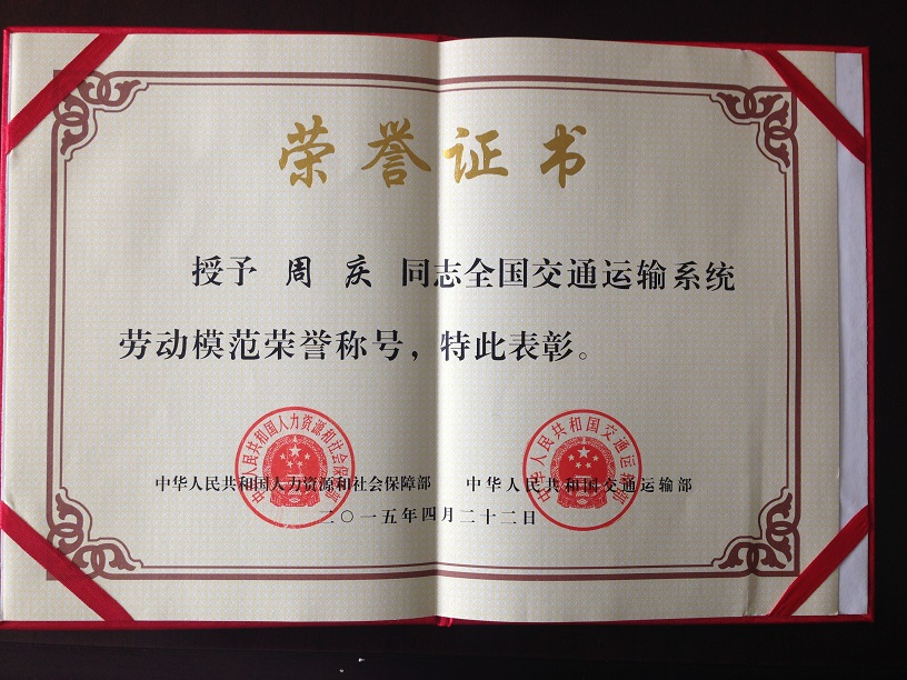 駕駛員周慶榮獲“全國交通運(yùn)輸系統(tǒng)勞動(dòng)模范”稱號