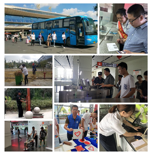 車(chē)站各班組分工協(xié)作打掃各自責(zé)任區(qū)域,清掃工作臺(tái)、參加"志愿服務(wù)  美好你我他"第三屆江蘇志愿服務(wù)展示交流活動(dòng)、清掃路邊綠化帶、噴灑藥水、除雜草滅蟲(chóng)害、整理通道入口、設(shè)備設(shè)施維護(hù)、消防安全檢查、身份實(shí)名驗(yàn)證、檢查危險(xiǎn)禁運(yùn)物品、檢查客車(chē)安全帶、為特殊旅客提供一站式服務(wù)、熱情引導(dǎo)購(gòu)票、候車(chē),征詢旅客意見(jiàn)、開(kāi)展問(wèn)卷調(diào)查,以整潔的站區(qū)環(huán)境、良好的精神風(fēng)貌和優(yōu)質(zhì)的候乘服務(wù)當(dāng)好東道主,文明迎盛會(huì)。