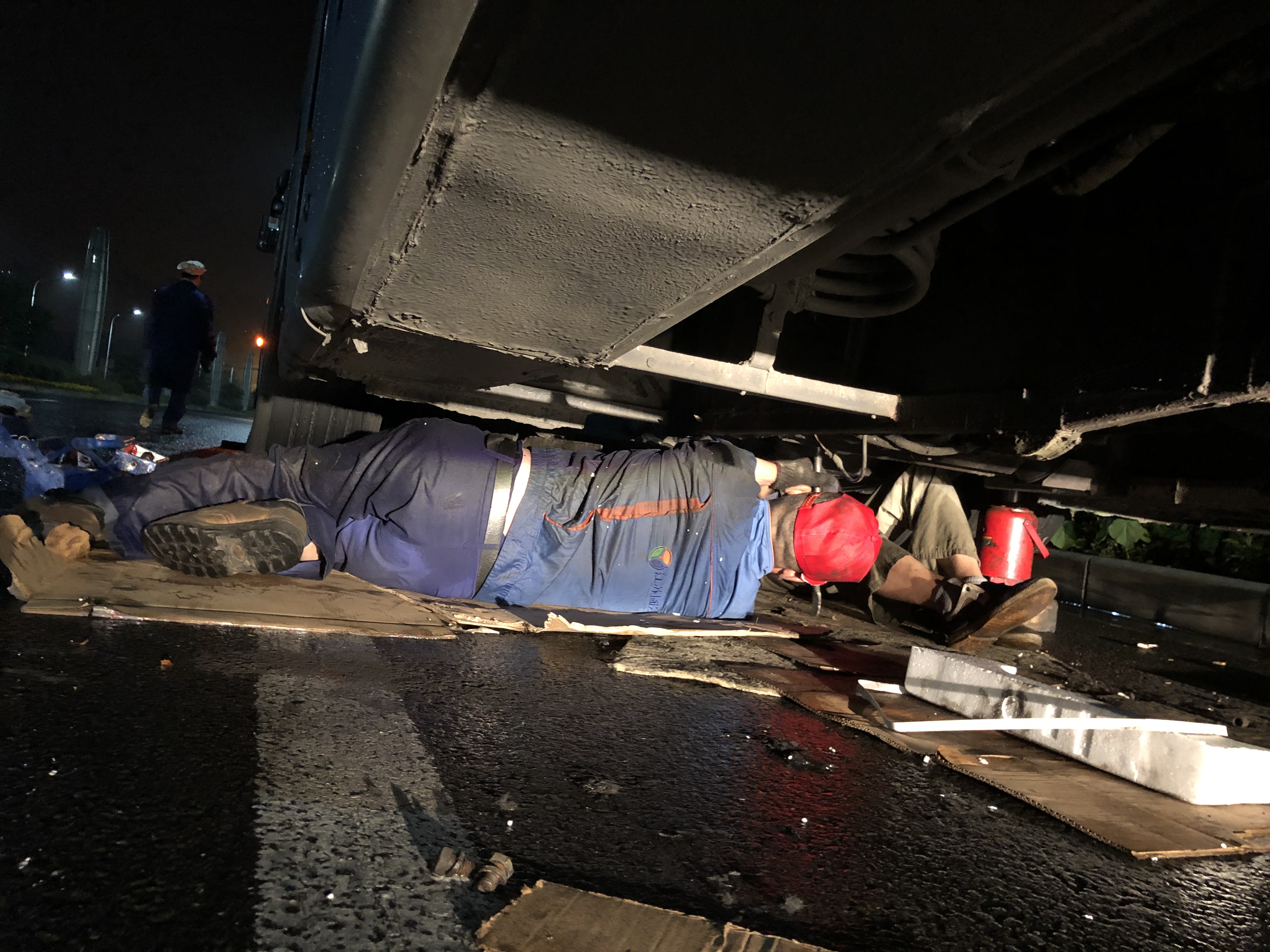 為了快速查出車(chē)輛故障,來(lái)到現(xiàn)場(chǎng)后師傅們也顧不得許多,只是簡(jiǎn)單地做了避雨防護(hù),就開(kāi)始查找每一處可疑的故障,原來(lái)是離合器片磨損無(wú)法啟動(dòng),需要進(jìn)行更換。此時(shí)客服中心又聯(lián)系了在家休息的青工花兆貴,他冒雨回廠領(lǐng)取離合器三件套,再趕赴故障現(xiàn)場(chǎng)進(jìn)行安裝。由于是露天作業(yè),加之夜晚陰雨天氣,視線模糊,給維修工作帶來(lái)很大難度,但是維修師傅們團(tuán)結(jié)協(xié)作,經(jīng)過(guò)數(shù)小時(shí)的緊張搶修,故障解除,而此時(shí)搶修師傅們的衣服已經(jīng)完全濕透。
