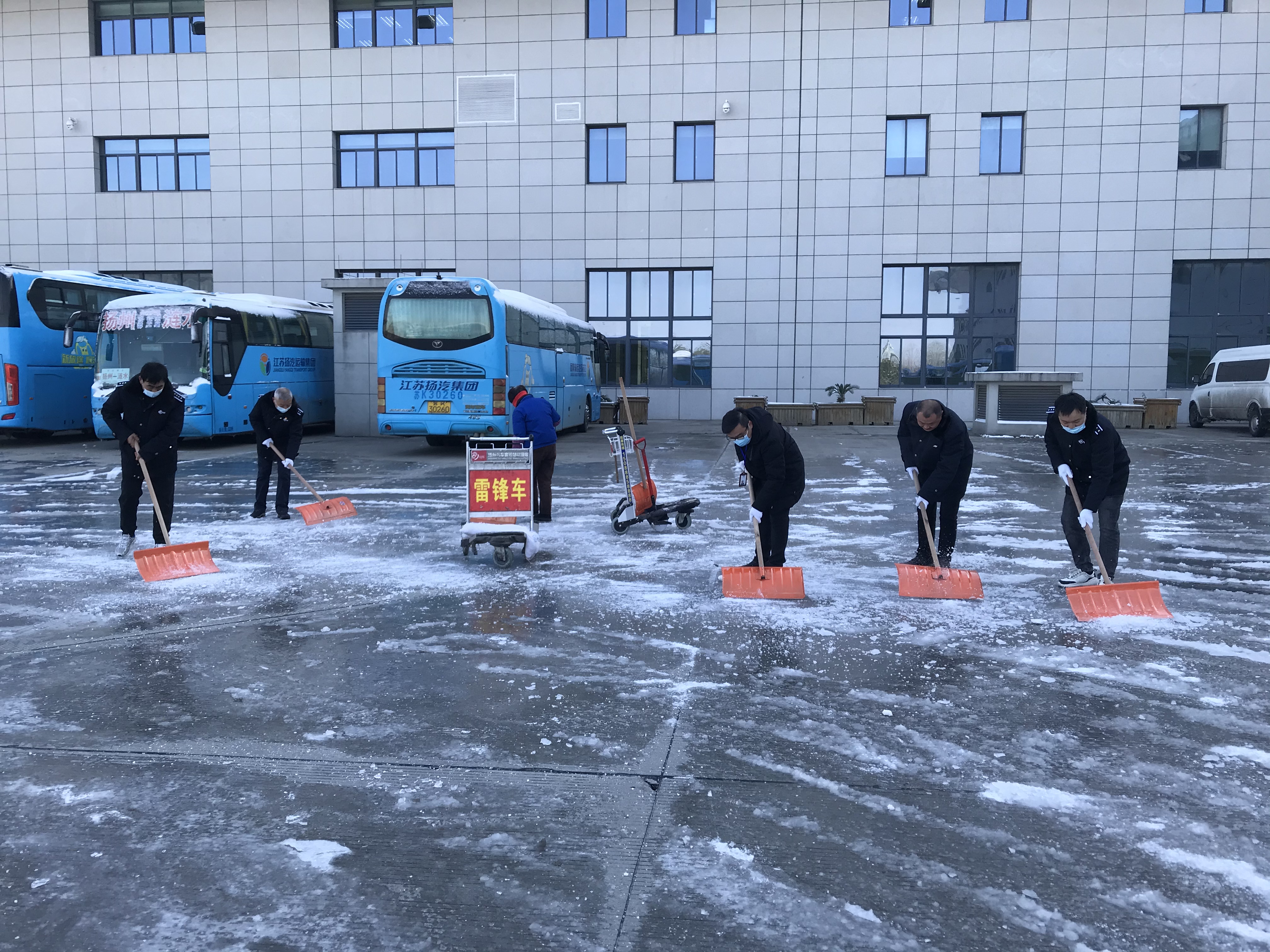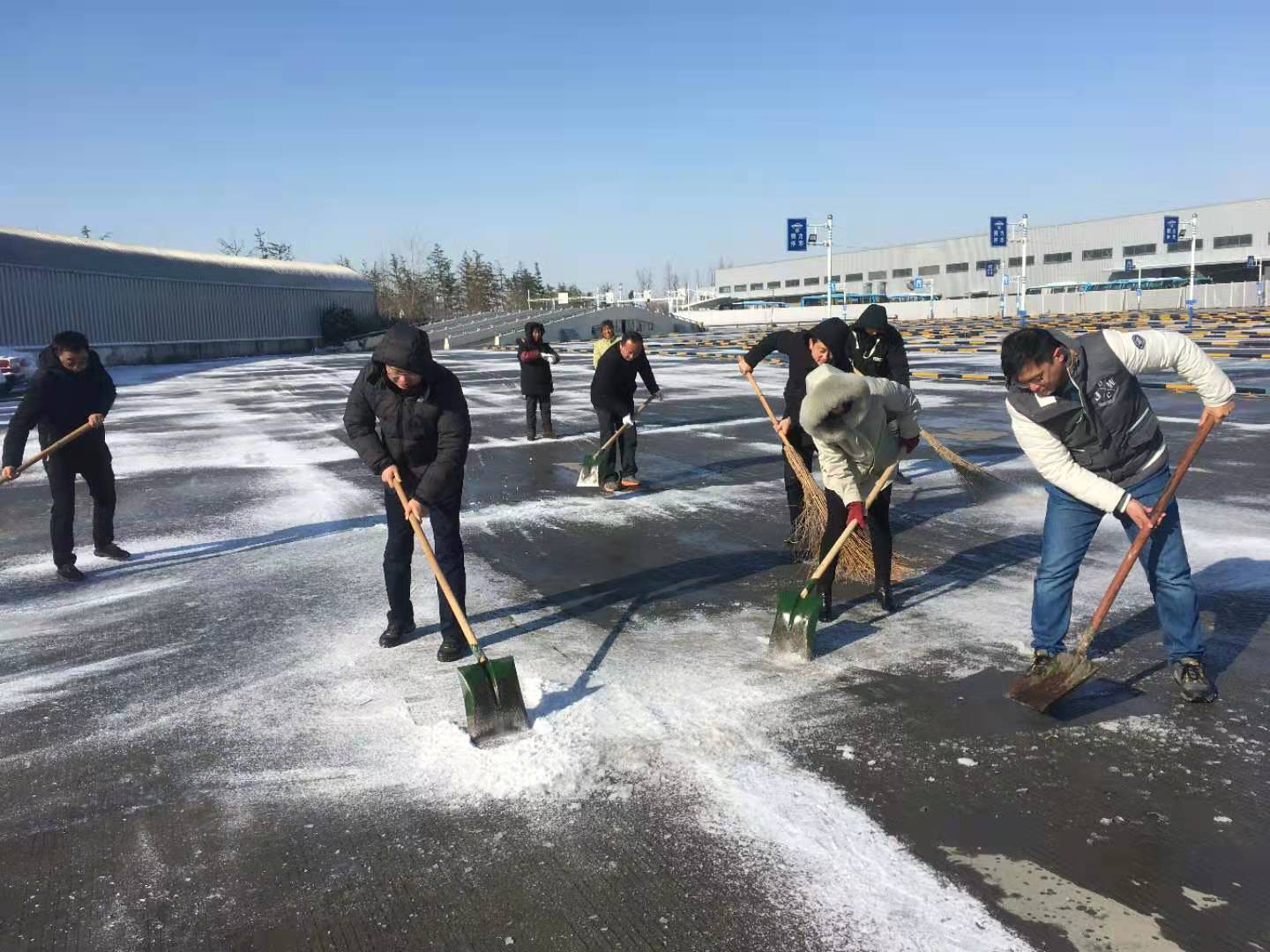 12月30日早上各黨支部積極響應(yīng)集團(tuán)黨委號(hào)召,組織黨員干部、管理人員協(xié)助車站清理積雪,在站前廣場、發(fā)車平臺(tái),進(jìn)出站口等重點(diǎn)部位,大家拿著掃把、草墊、鐵鍬、雪鏟,充分發(fā)揮團(tuán)隊(duì)協(xié)作精神,干勁十足,一派熱火朝天景象,為班線開通做好后勤保障。