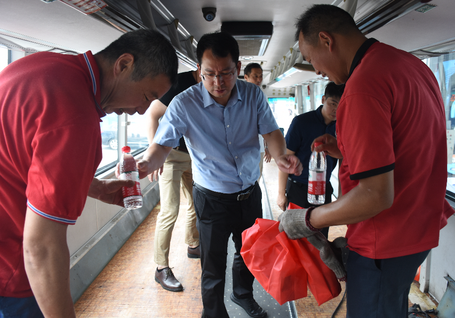 為認真貫徹落實習(xí)近平總書記關(guān)于安全生產(chǎn)工作的重要指示精神,扎實做好夏季安全生產(chǎn)工作,保障廣大職工在生產(chǎn)過程中的安全和健康,7月22日中午,市交通產(chǎn)業(yè)集團副總經(jīng)理、揚汽集團黨委書記、董事長龔宇峰利用午休時間到修理廠,對奮戰(zhàn)在高溫一線,加班加點趕制新冠疫苗接種服務(wù)車的職工進行慰問。