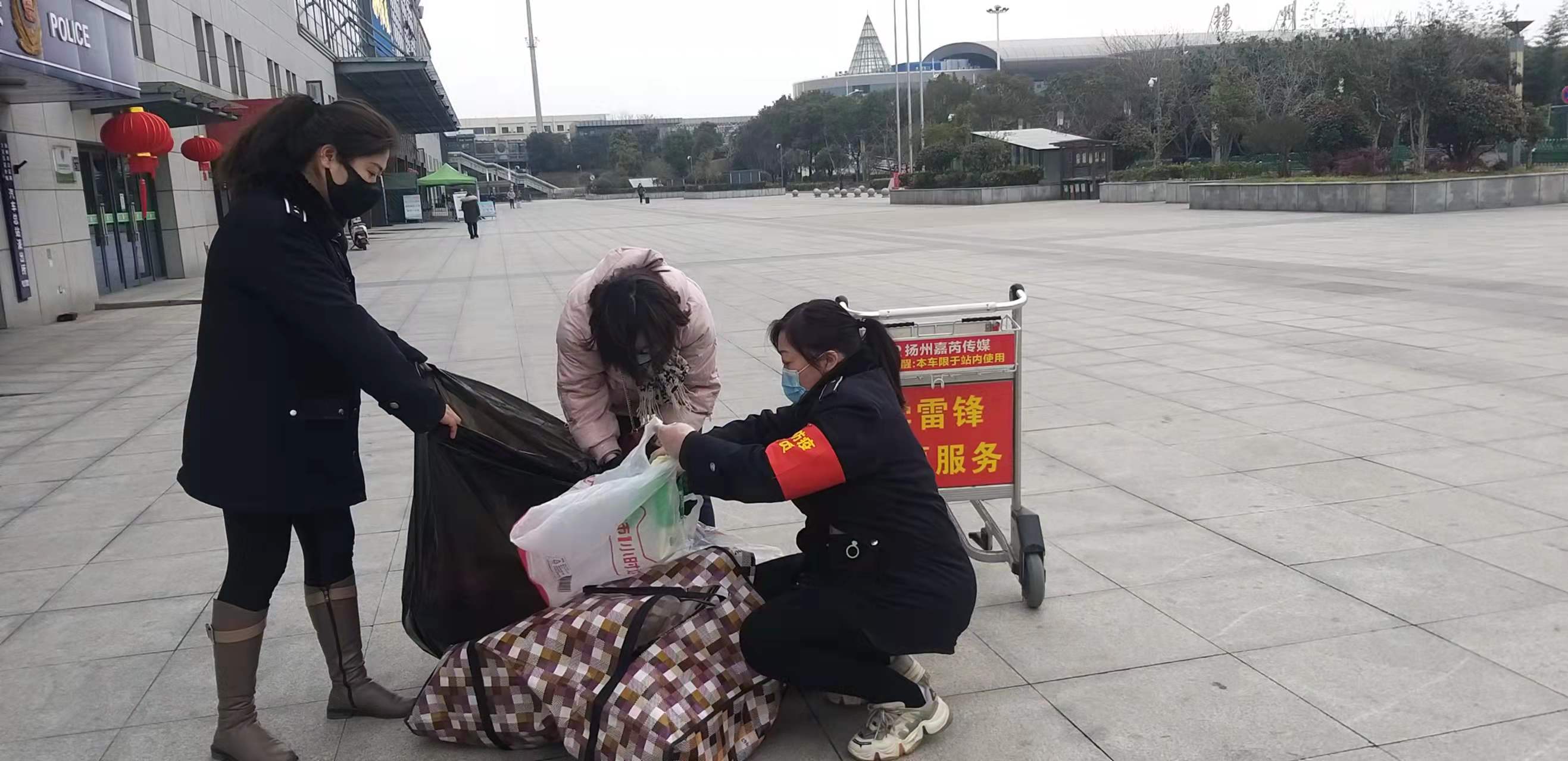 1月29日下午4點(diǎn)時(shí)分,西部客運(yùn)樞紐揚(yáng)州汽車站務(wù)中心工作人員殷丹和薛揚(yáng),日常工作巡查時(shí),在站前廣場(chǎng)進(jìn)口處,看到一名旅客蹲在地上,手里抱著散落一地的行李無(wú)計(jì)可施,焦急萬(wàn)分。