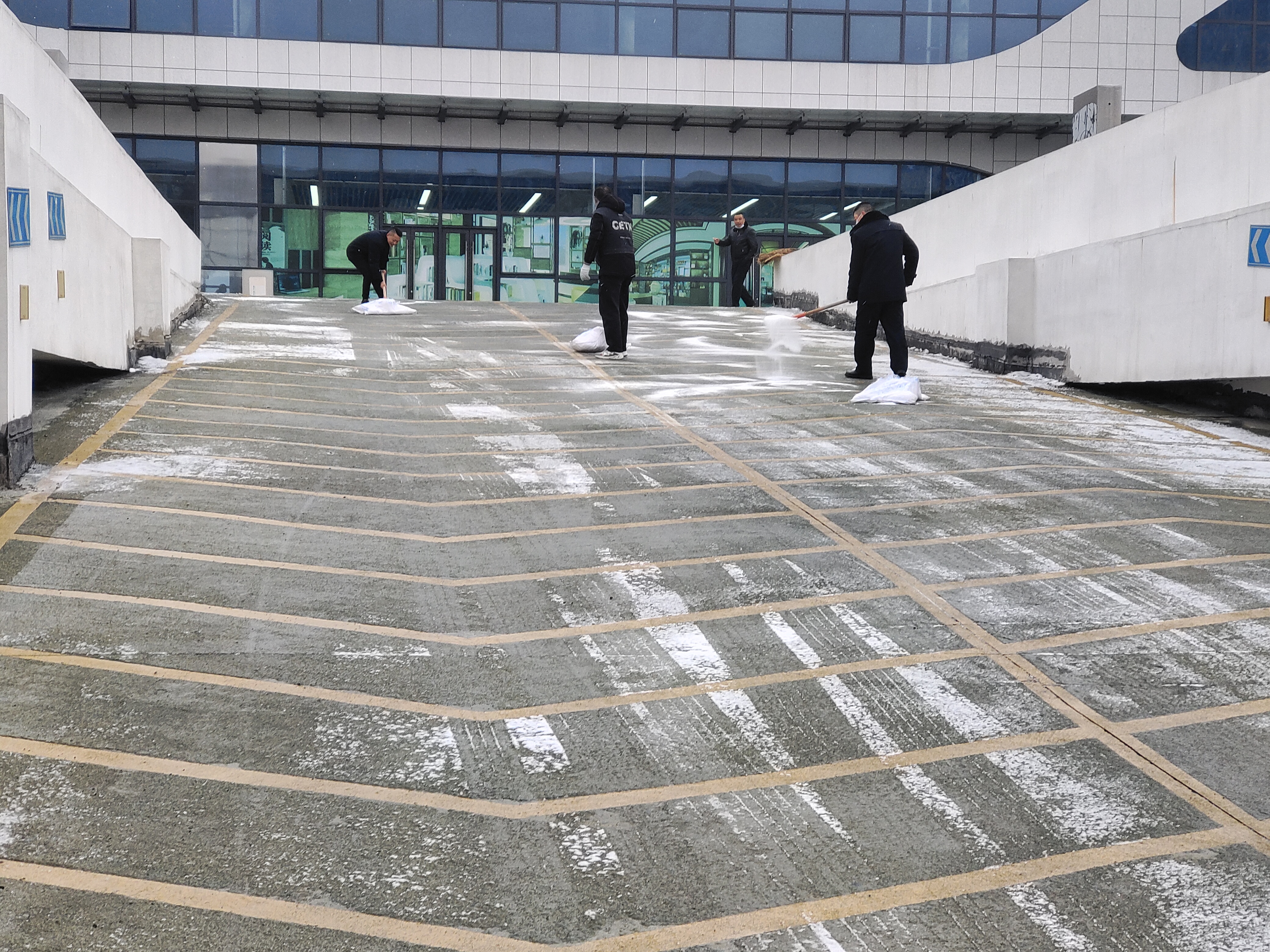 在揚(yáng)汽修理廠,為防止廠區(qū)地面冰凍,各部門、班組迅速對(duì)全廠范圍內(nèi)的積雪進(jìn)行清除,對(duì)廠區(qū)內(nèi)主干道、例保通道、倉房陰面等區(qū)域噴撒融雪劑,為例保通道鋪上防滑草墊,確保廠區(qū)道路暢通。